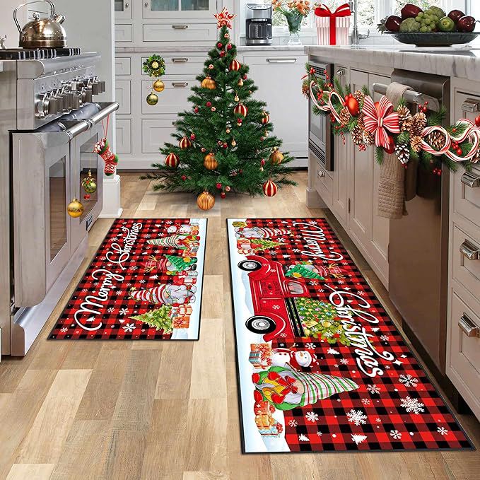 Ten świąteczny chodnik do kuchni wyróżnia się klasycznym połączeniem czerwieni i czerni w kratę, przełamanym żywą zielenią oraz bielą zimowych akcentów. Na jego powierzchni widnieje retro czerwona ciężarówka pełna prezentów i choinkowych ozdób, otoczona delikatnymi płatkami śniegu i świątecznym napisem. To dekoracyjny i praktyczny element, który od razu wniesie do wnętrza ciepły, radosny nastrój świąt.