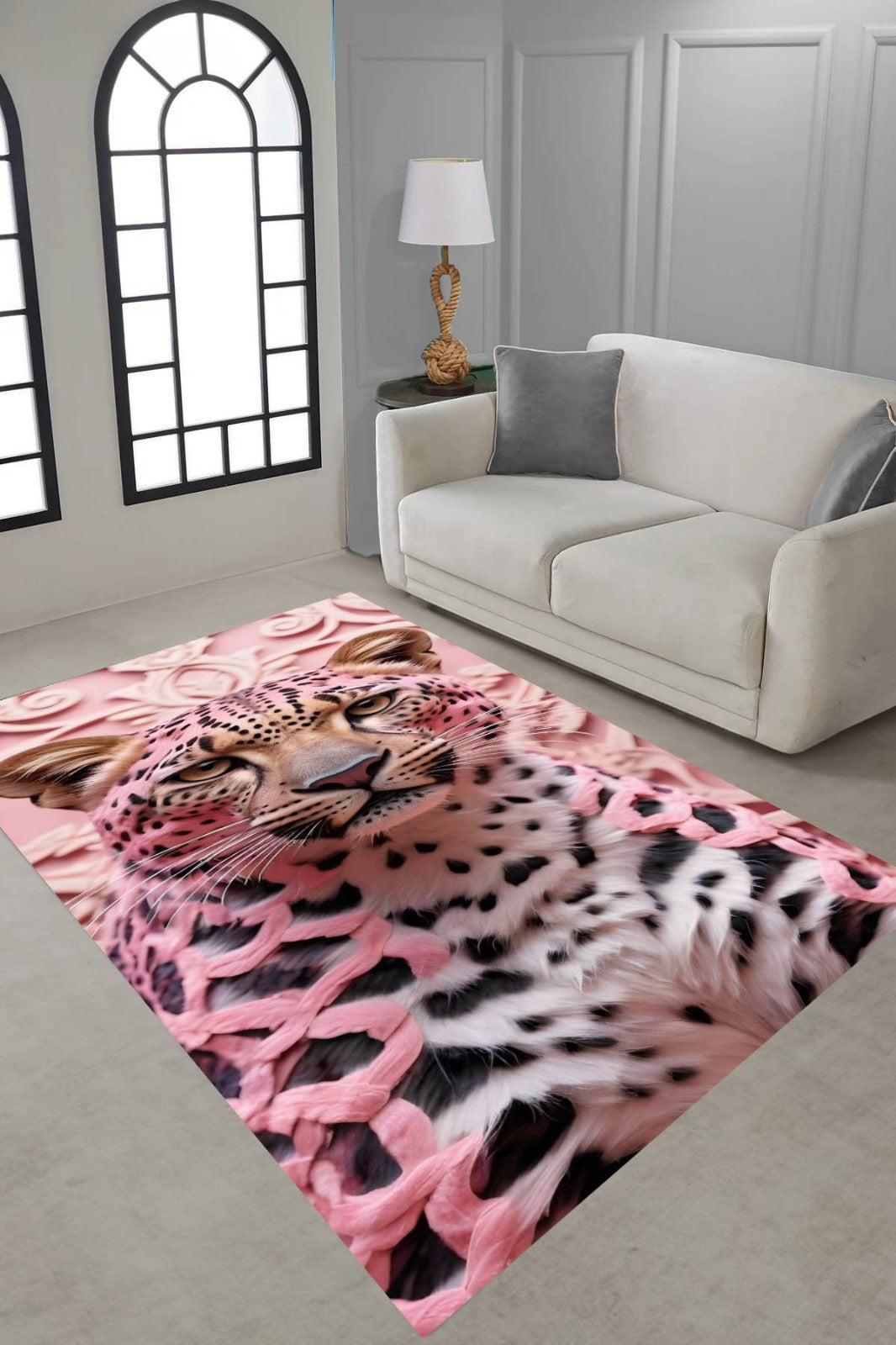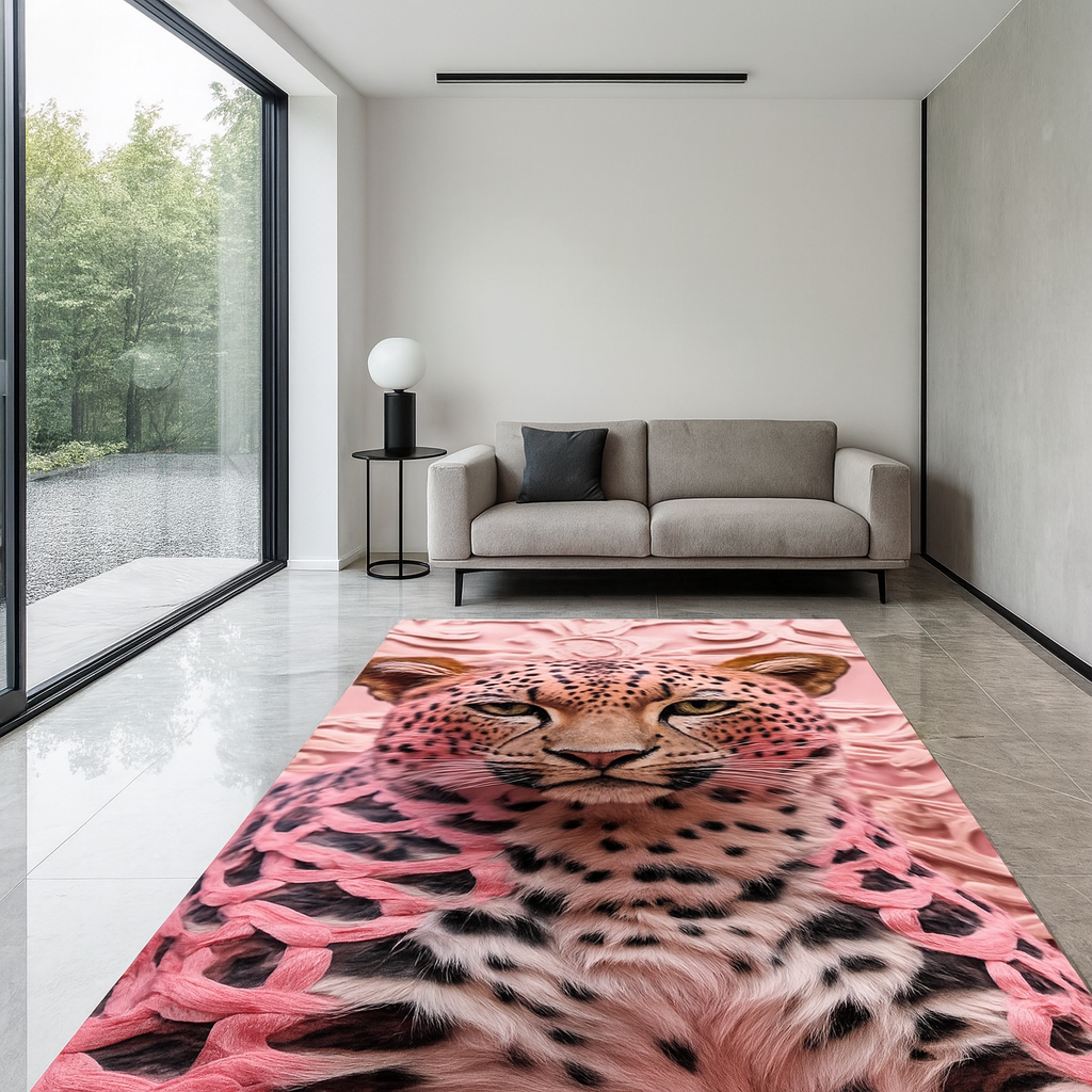Dywan przedstawia majestatycznego lamparta otulonego różowymi akcentami, łącząc dziką naturę z delikatną, romantyczną estetyką. Kontrast czerni i beżu futra z subtelnymi odcieniami różu tworzy efektowną, nowoczesną kompozycję symbolizującą siłę, elegancję i wyjątkowy styl. To wyrazisty akcent dekoracyjny, który ożywia wnętrze i przyciąga uwagę.