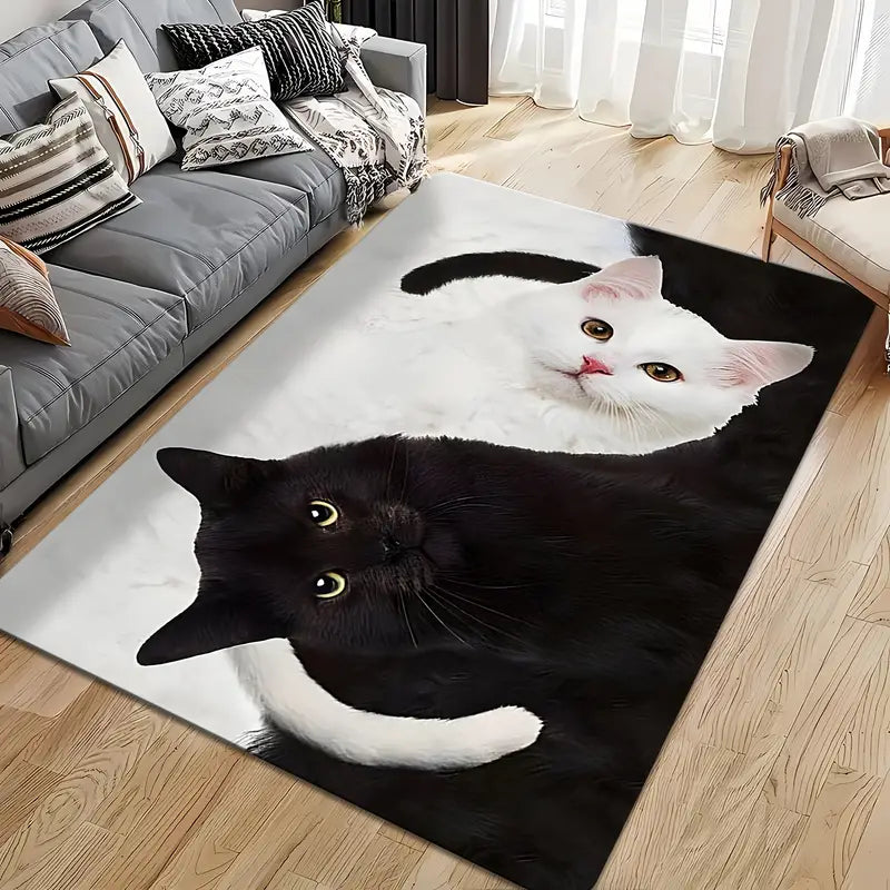 Na dywanie z motywem zwierzęcym dominują dwa koty, jeden czarny, drugi biały, splecione ze sobą w uroczy układ. Ich delikatne uszy, łapki i ogonki nadają im wyjątkowego uroku, a ich oczy emanują ciekawością i przyjaźnią. Kompozycja czarno-biała jest elegancka i uniwersalna, pasująca do różnorodnych stylów wnętrzarskich. Dodaje pomieszczeniu nutki przytulności i uroku zwierzęcego towarzystwa, idealna dla miłośników kotów i minimalistycznego designu.