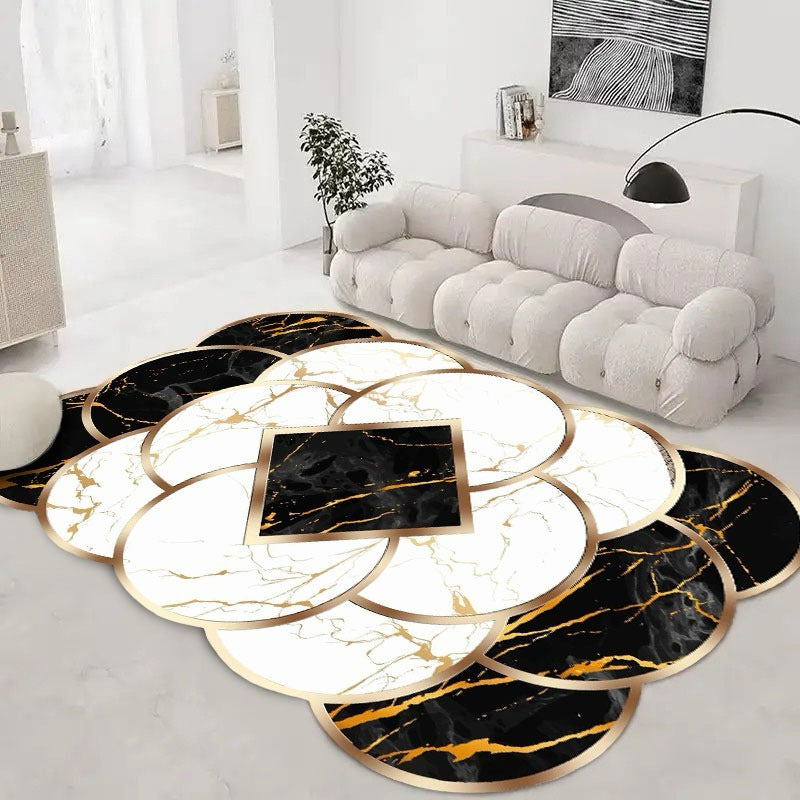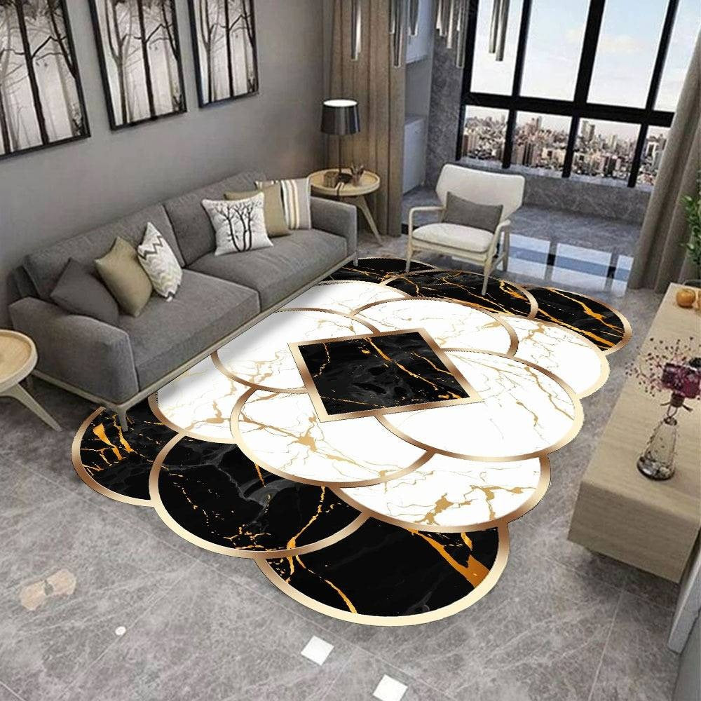 Dywany o nieregularnym kształcie - koła z imitacją złotego marmuru to stylowy i elegancki dodatek do każdego wnętrza. Ten produkt ma unikalny kształt, co sprawia, że jest to idealne rozwiązanie dla osób, które poszukują oryginalnych i nietypowych rozwiązań, które będą dekoracja dla ich wnętrza. Zastosowanie imitacji złotego marmuru nadaje mu niezwykłego charakteru i eleganckiego wyglądu. Kolorystyka dywanów jest stonowana, co pozwala na łatwe dopasowanie ich do różnych aranżacji wnętrz. Dywan z imitacją złotego marmuru to idealny wybór dla osób, które poszukują niebanalnych dodatków do swojego domu. Można go wykorzystać jako element dekoracyjny w salonie, sypialni czy gabinecie. Jego nieregularny kształt i wyjątkowy design sprawią, że będzie stanowił centralny punkt każdego pomieszczenia.