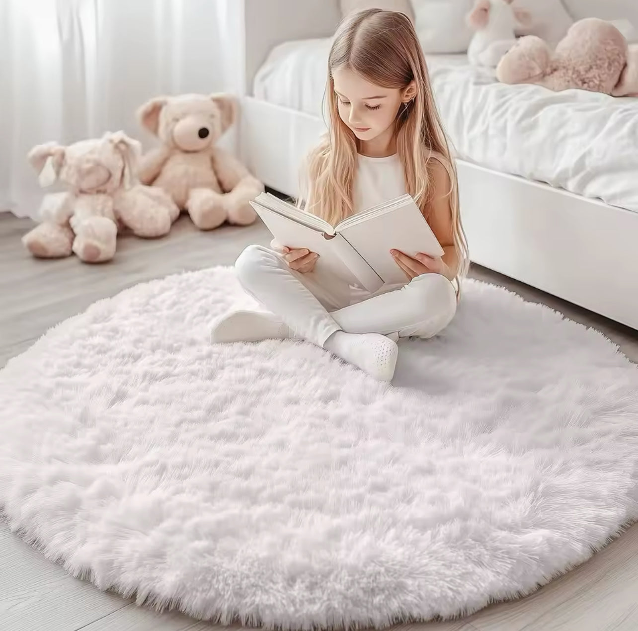 Bardzo miękki okrągły, puszysty dywan ze sztucznego, nadającego się do prania futerka z pewnością nada Twojemu wnętrzu charakteru.