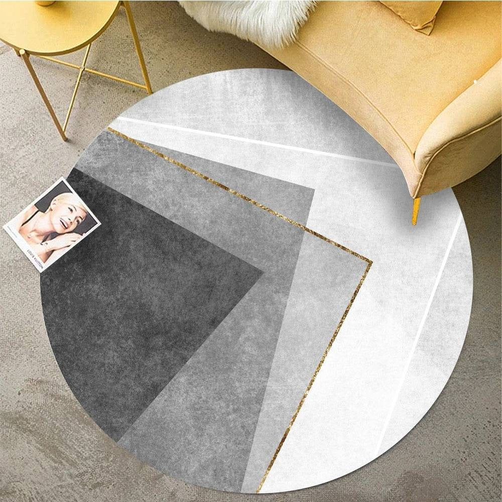Dywan okrągły z geometrycznym wzorem to idealna propozycja dla osób ceniących sobie designerskie rozwiązania w aranżacji wnętrz. Wzór, który zdobi powierzchnię dywanu, to połączenie klasycznych elementów geometrycznych. Dominującym kolorem w tym dywanie jest szarość, która harmonijnie współgra z białymi elementami wzoru, tworząc wyrafinowaną całość. Dywan posiada też subtelne wstawki w odcieniach złota, co sprawia, że wygląda bardzo elegancko i nowocześnie. Dywan okrągły z geometrycznym wzorem doskonale wpisuje się w trendy aranżacyjne, zwłaszcza jeśli szukasz elementu, który przyciągnie uwagę w Twoim wnętrzu. Dywan ten świetnie sprawdzi się zarówno w minimalistycznych, jak i bardziej złożonych aranżacjach.