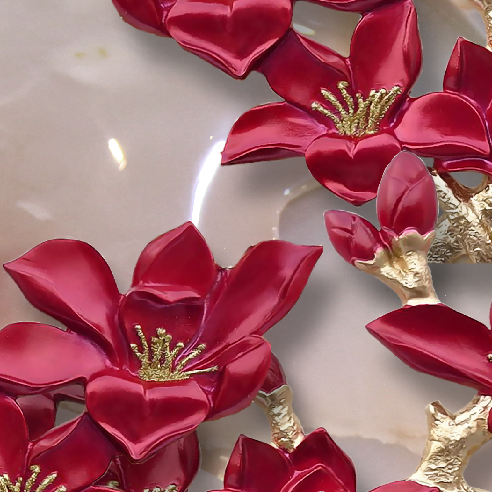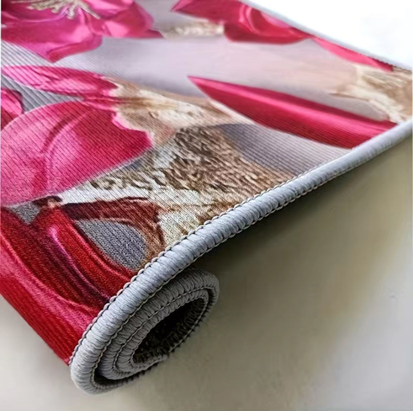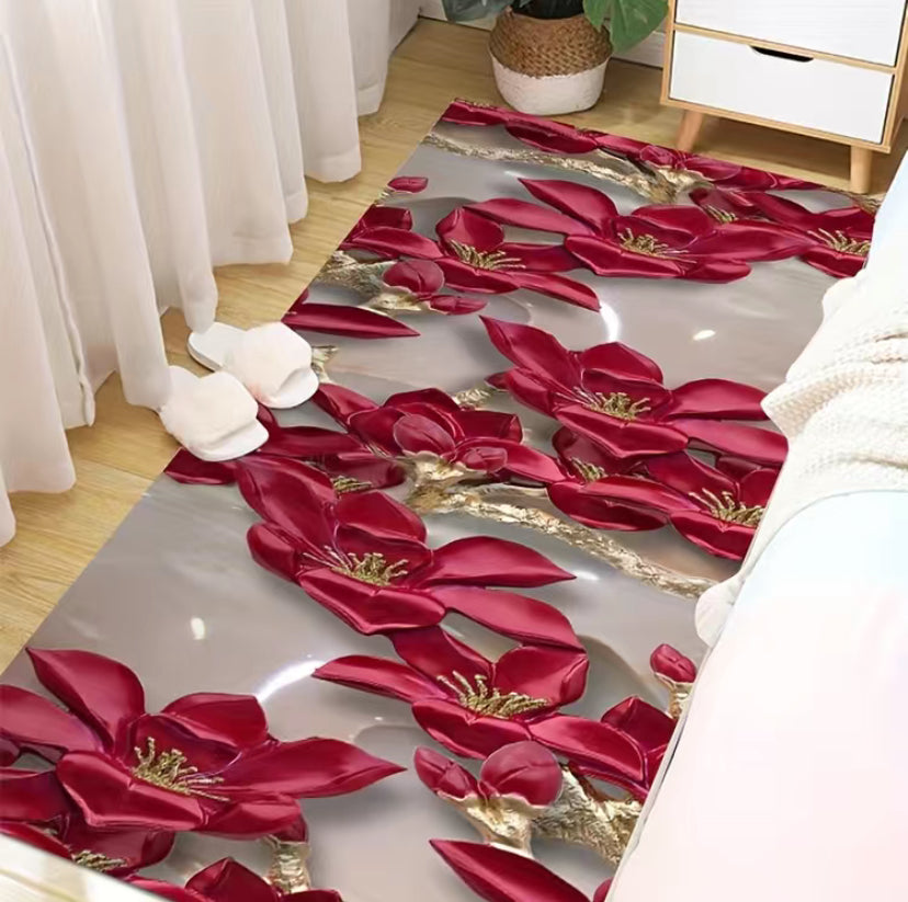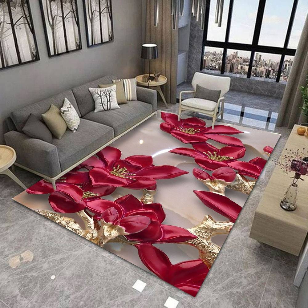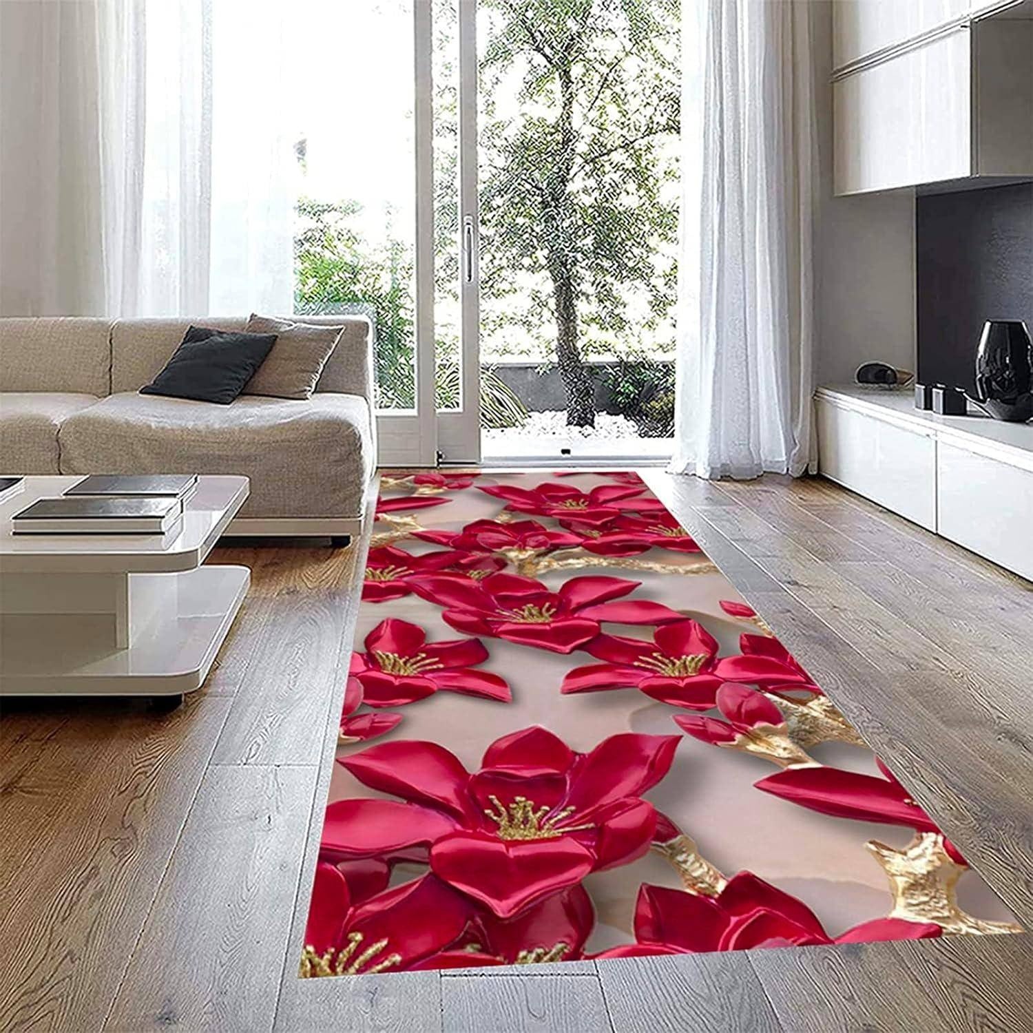 Dywan 3D z motywem kwiatów to elegancki i oryginalny element dekoracyjny, który z pewnością przyciągnie uwagę każdego gościa. Taki dywan ma trójwymiarowy wzór kwiatowy, co nadaje mu dodatkowej głębi i intensywności. Czerwone kwiaty na beżowym tle i złote elementy liści to piękna i elegancka kolorystyka, która nadaje się do różnych stylów wystroju wnętrz. Czerwony kolor kwiatów symbolizuje miłość, pasję i energię, a beżowy kolor tła dodaje subtelności i harmonii. Złote elementy liści to elegancki dodatek, który podkreśla luksus i prestiż.