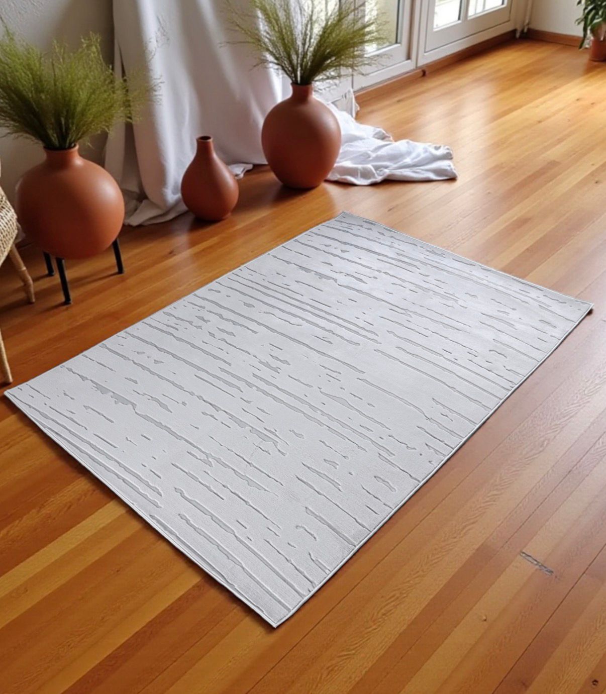 Elegancki dywan inspirowany prostotą natury, wyróżniający się miękką fakturą i subtelną grą odcieni bieli oraz jasnej szarości. Tworzy spokojne tło dla wnętrz w stylu japandi, boho i minimalistycznym.