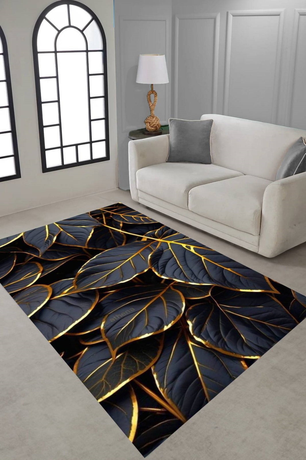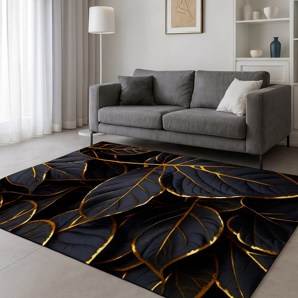 Elegancki dywan o nowoczesnym designie z motywem dużych liści w odcieniach czerni i granatu, obrysowanych złotymi liniami, które pięknie odbijają światło i dodają całości szlachetnego wyrazu. Intensywna, ciemna kolorystyka zestawiona z połyskiem złota tworzy wyraźny kontrast, przyciągający wzrok i podkreślający charakter wnętrza.
