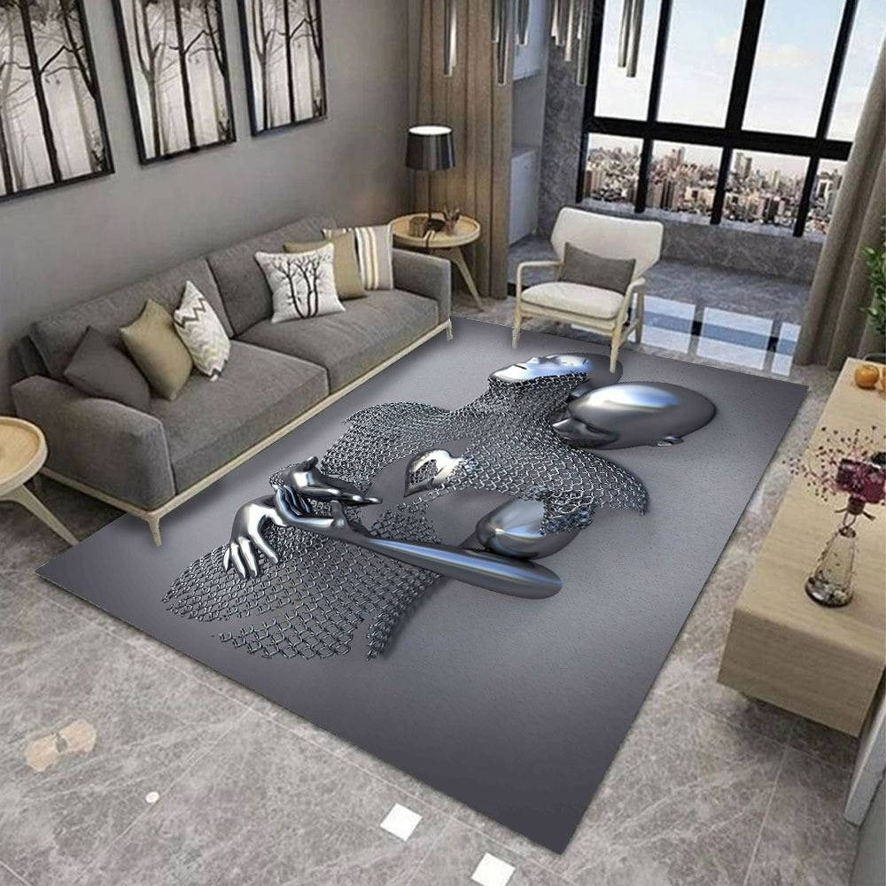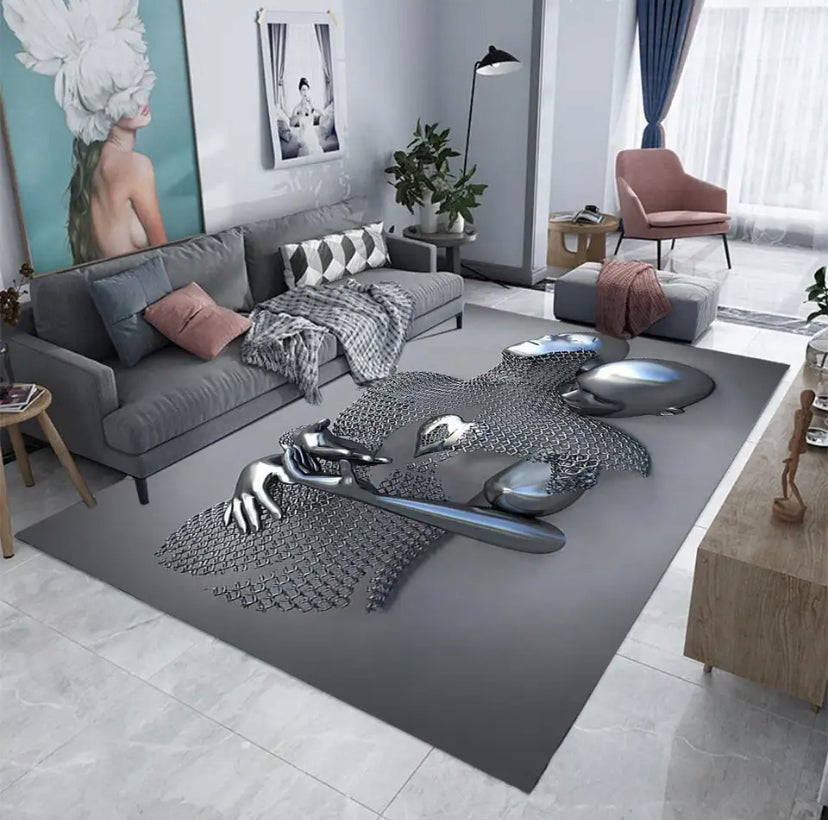 Nowoczesny dywan ze wzorem w efekcie 3D | "Metalowa Miłość" to elegancki i wyjątkowy dodatek do każdego wnętrza. Wzór na dywanie przedstawia dwie postacie w uścisku, niczym metalowe rzeźby, które dzięki efektowi 3D nabierają trójwymiarowości i głębi. Całość tworzy piękny i romantyczny obraz, który przyciąga uwagę i dodaje pomieszczeniu wyjątkowego klimatu.