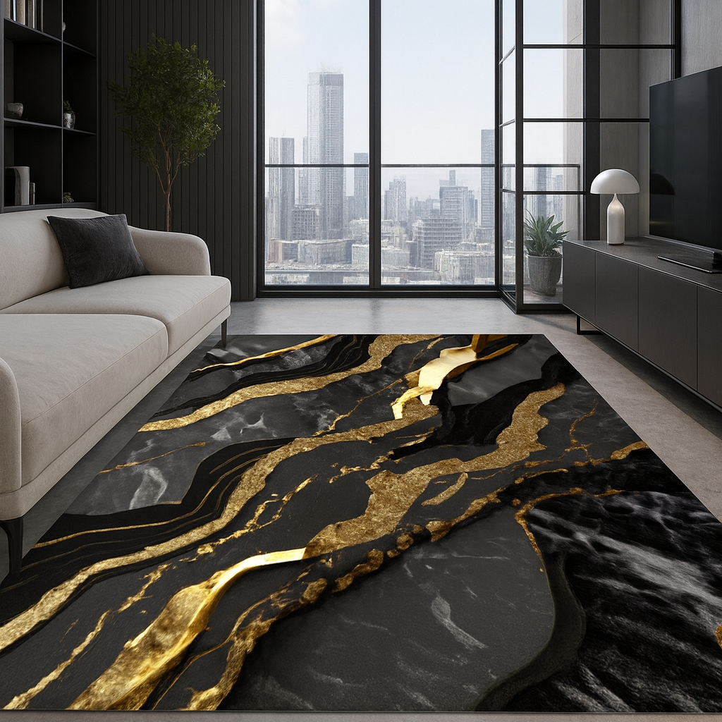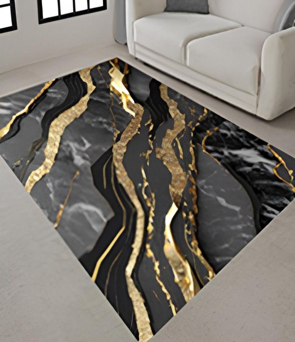 Stylowy czarny dywan ze złotymi detalami utrzymany w nowoczesnym stylu, który zachwyca kontrastem głębokiej czerni i efektownych, błyszczących akcentów w kolorze złota. Dynamiczny, marmurowy wzór nadaje całości luksusowego charakteru i tworzy mocny, dekoracyjny punkt we wnętrzu.