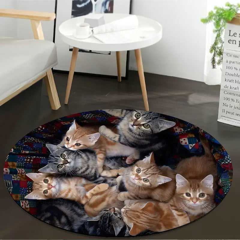 Okrągły dywan zatytułowany "Koci Świat" jest pełen uroku i zabawy, przynosząc do wnętrza nutkę kociej magii.